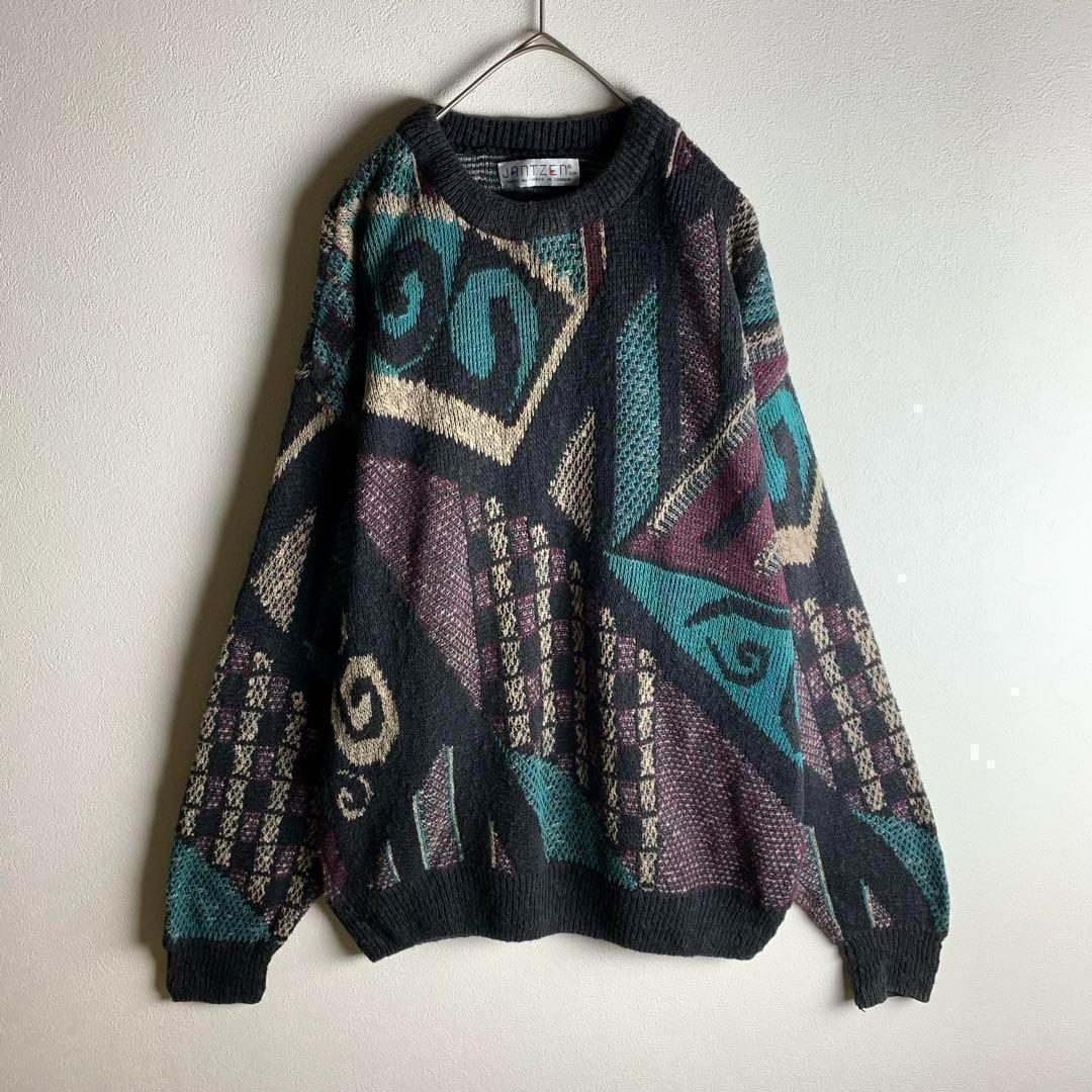 - ニット セーター カナダ製 アシンメトリー ダークカラー 総柄 ゆるだぼ お洒落 メンズ 古着