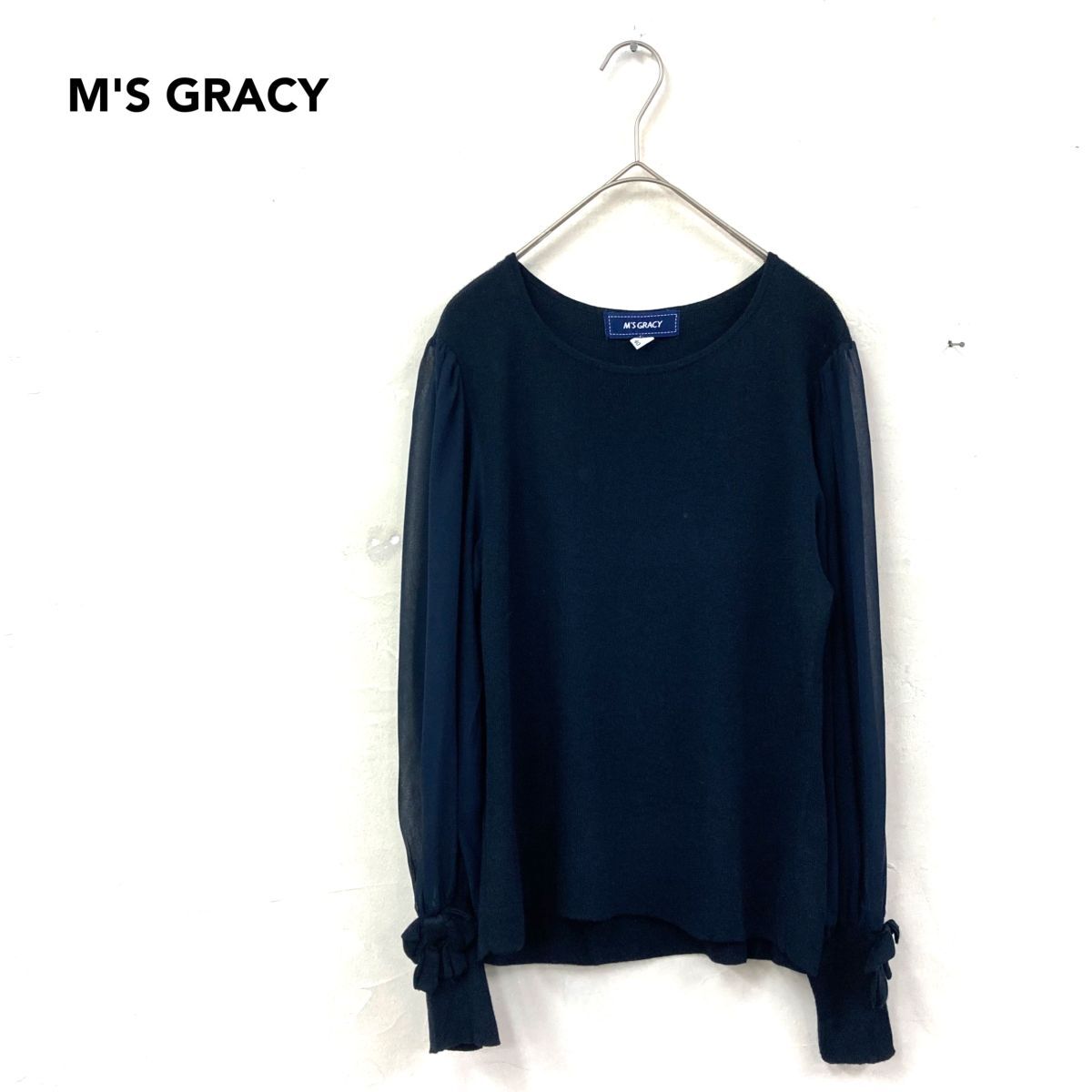 - 2O2058-Q◆M'S GRACY エムズグレイシー ブラウス 袖 切替 長袖 ニット プルオーバー レディース◆size 40 ネイビー 紺 レーヨン ナイロン