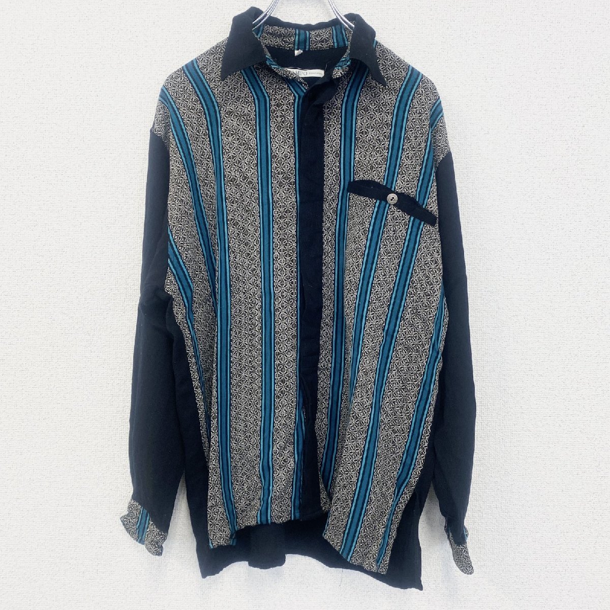 > 古着 used 長袖プリント総柄シャツ 比翼ボタン レトロデザイン ストライプ 個性的 黒 ブラック Mサイズ