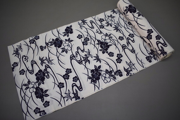 - A36-3【凛々】即決 新古品 本染 ゆかた反物 白 芝草 椿 梅 未仕立て品