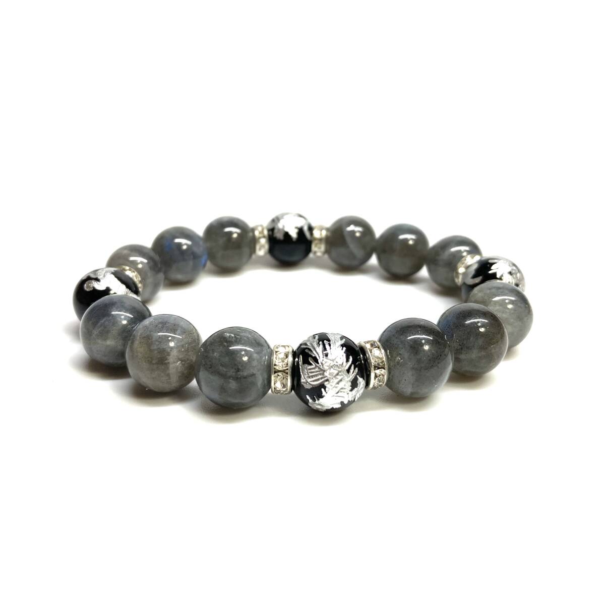 - 四神獣銀彫オニキス×ラブラドライト 12mm パワーストーン ブレスレット天然石 青龍 白虎 玄武 朱雀 運気上昇 金運 健康 お守り 四神獸 S