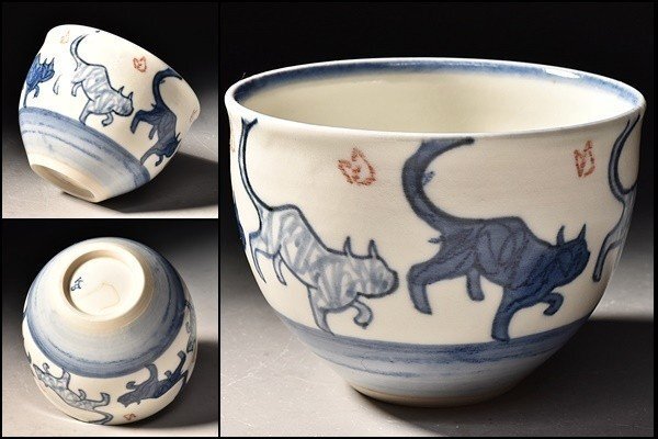> U07166 KATSUYUKI GIBO 儀保克幸 手描 染付 カップ 碗 彫刻家