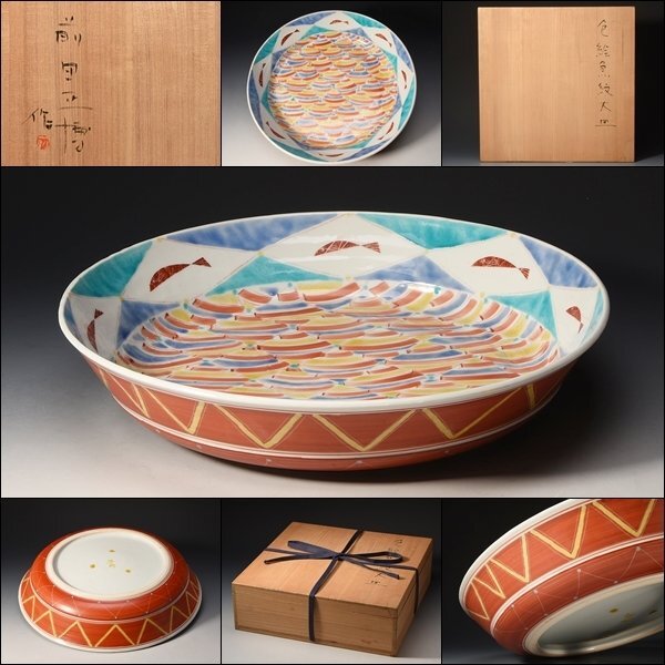 - U08090 希少 前田正博 本焼 色絵作品 色絵 魚文 大皿 皿 共箱