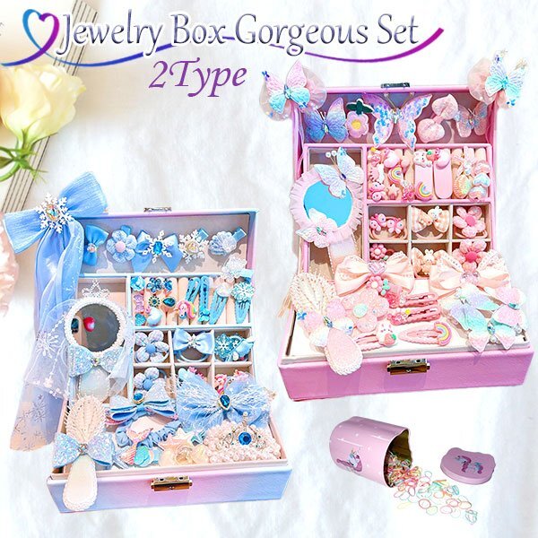 - ジュエリーBOX ゴージャスセット ピンク ブルー リボン 指輪 おもちゃ ヘアアクセサリ ヘアピン 子ども 子供 女の子 クリスマスプレゼント