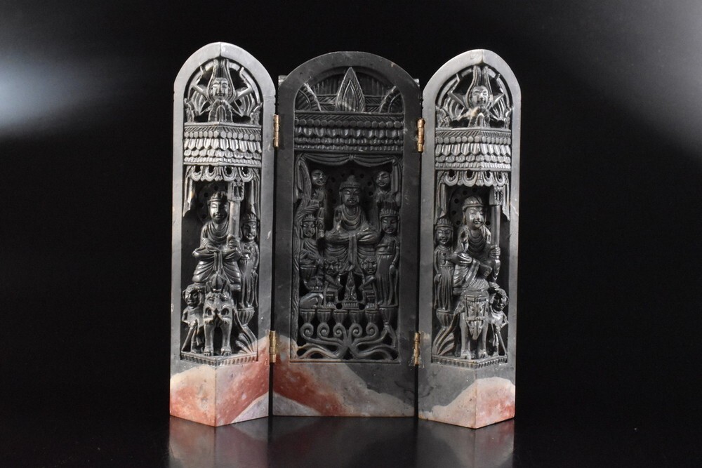 - 【雲】某名家買取品 仏教美術 石製玉製 仏像彫刻 置物 観音開き 古美術品(旧家蔵出) F8145