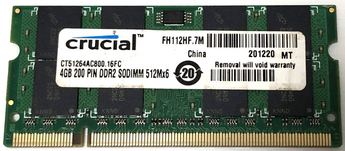 - 【送料無料】Crucial CT51264AC800.16FC(DDR2-800 PC2-6400 4GB SO-DIMM) 中古