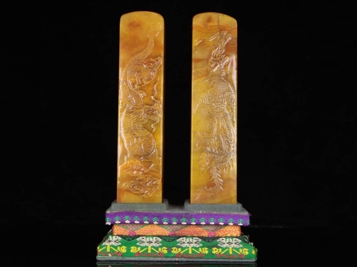- ▽鴻▽清朝時代 寿山石 田黄石彫 龍鳳紋印章一対 山堂作 箱付 時代物 中国古美術 骨董品