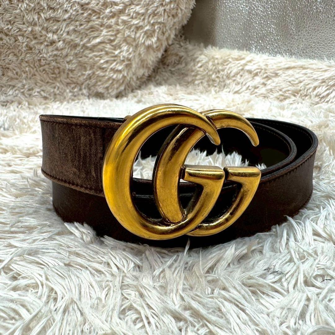 - 【美品】GUCCI グッチ ベルト ブラウン マーモント ゴールドロゴ レザー 本革 ユニセックス メンズ レディース 金具ロゴ ビジネス