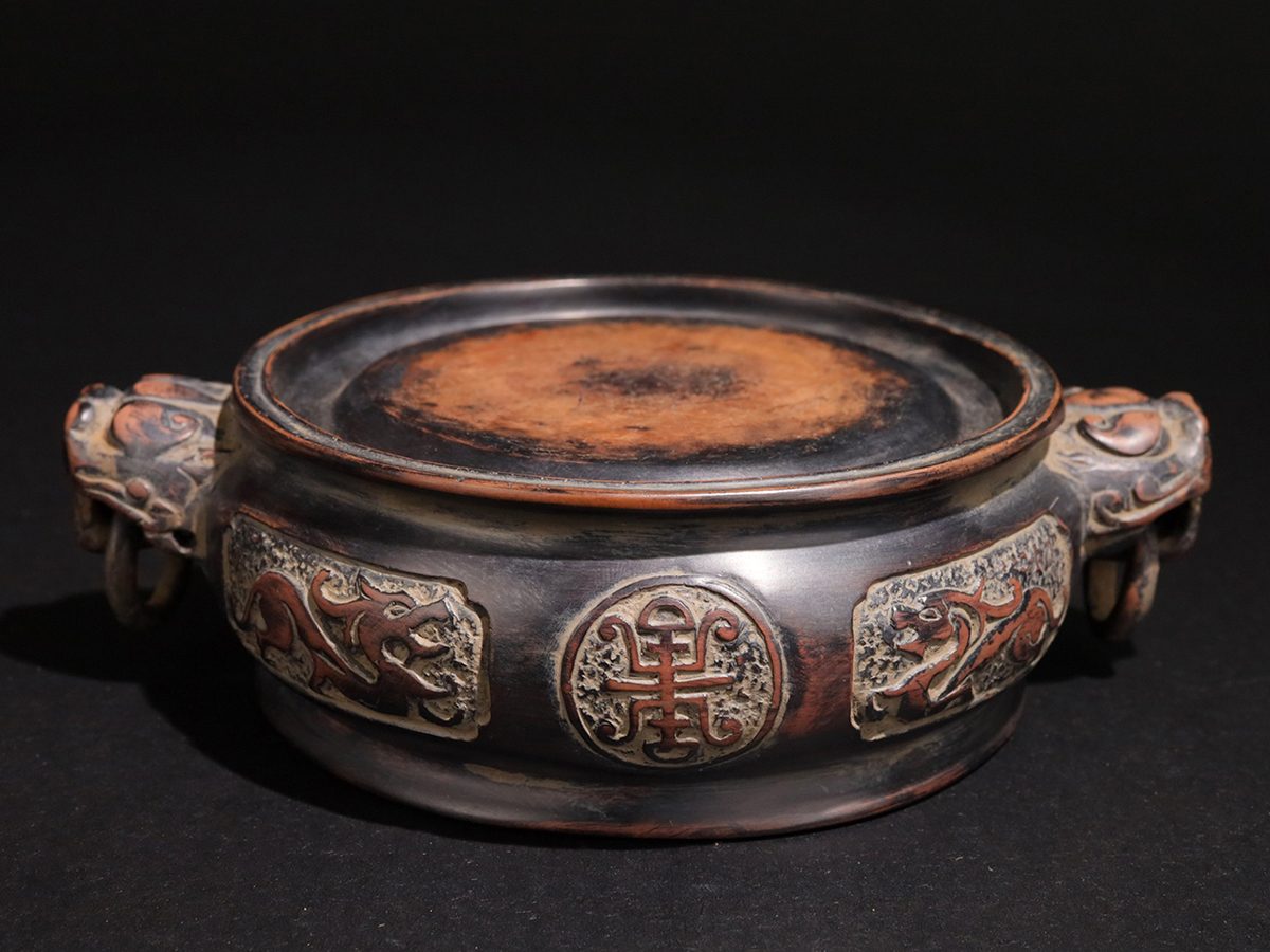 - ▽鴻▽清時代 紫金石硯 獣耳銜環紋炉形硯 梁国治銘 唐硯 墨寶 書道具 時代物 中国古美術 骨董品