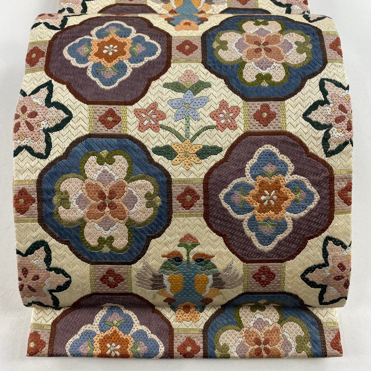 > 袋帯 逸品 花鳥 格子 刺繍 金糸 ベージュ 全通 正絹 【中古】