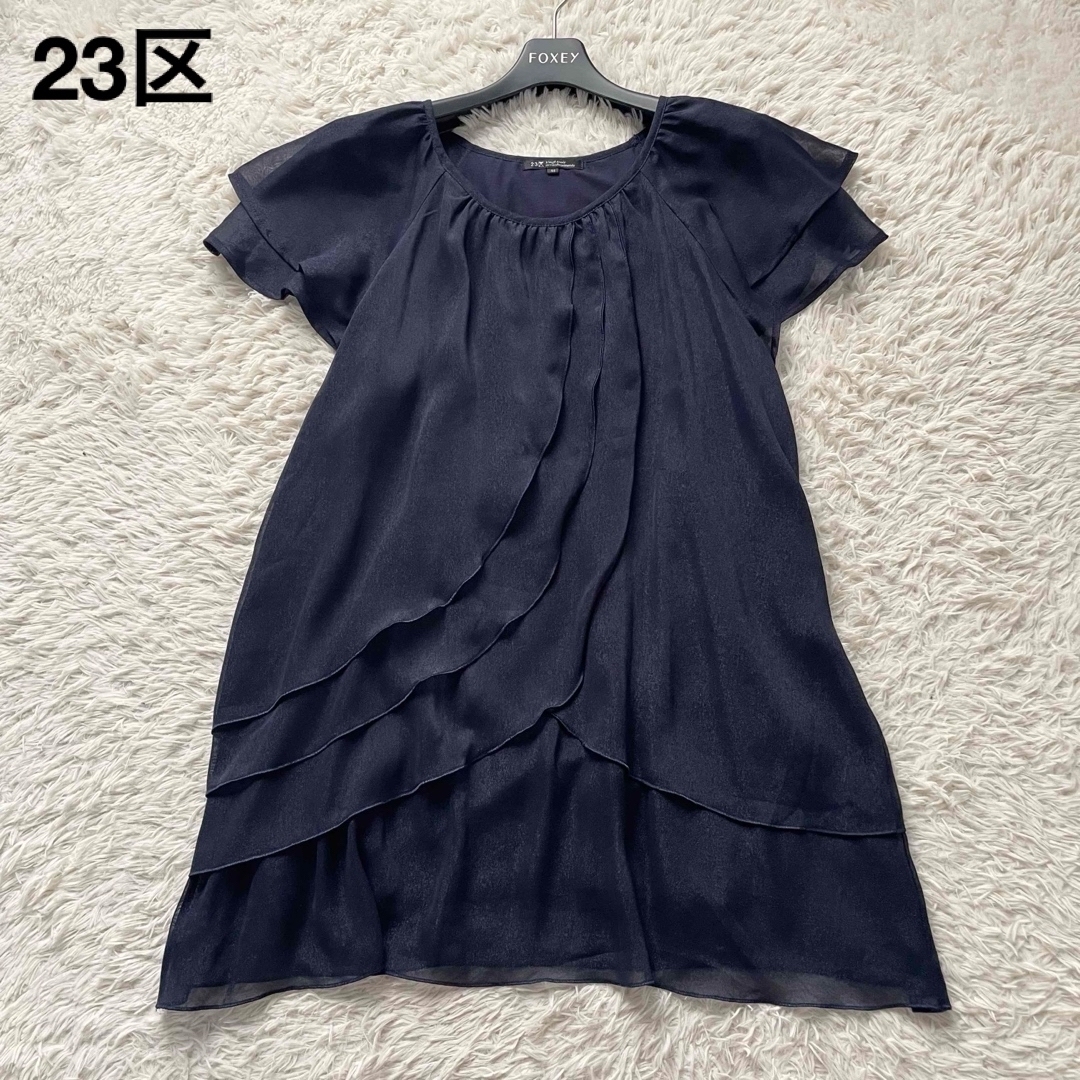 > 【美品】23区 オンワード樫山 ティアード シフォン チュニック ブラウス 紺 ネイビー 大きめ44サイズ