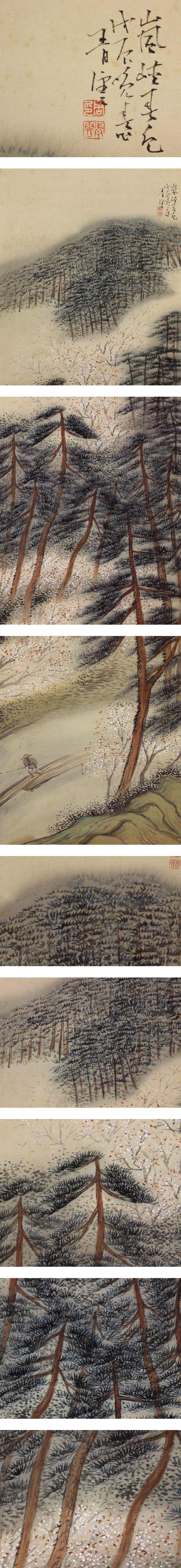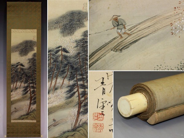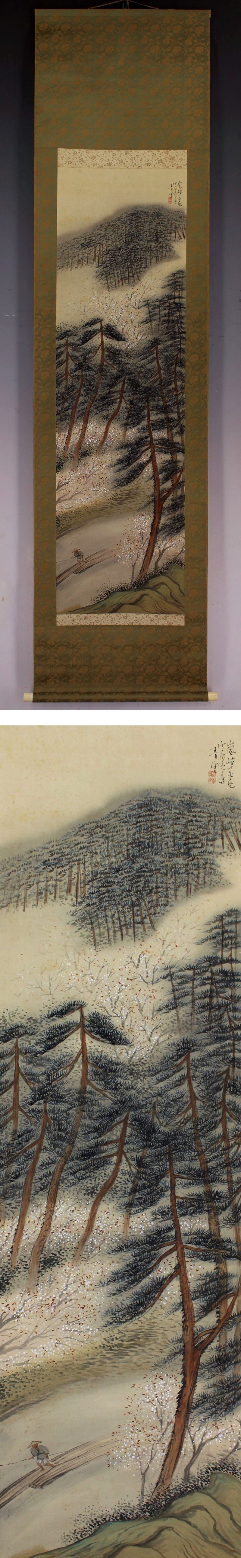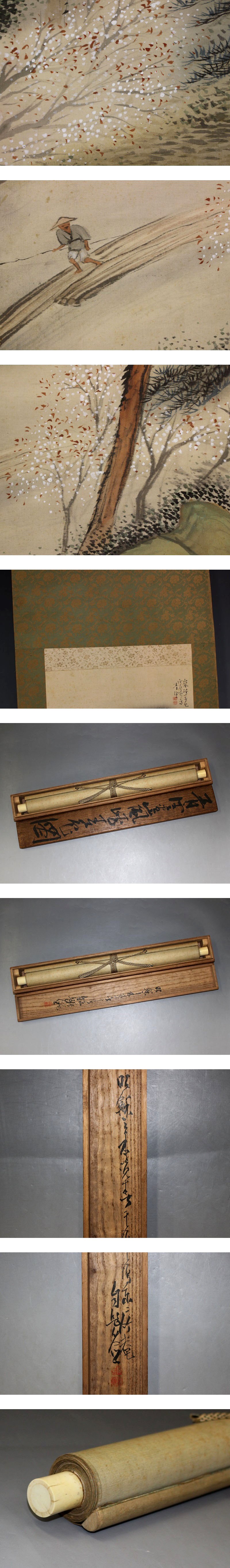 - 希少【真作】奥本青雲【嵐峡春色図】◆絹本◆共箱◆掛軸 x03222
