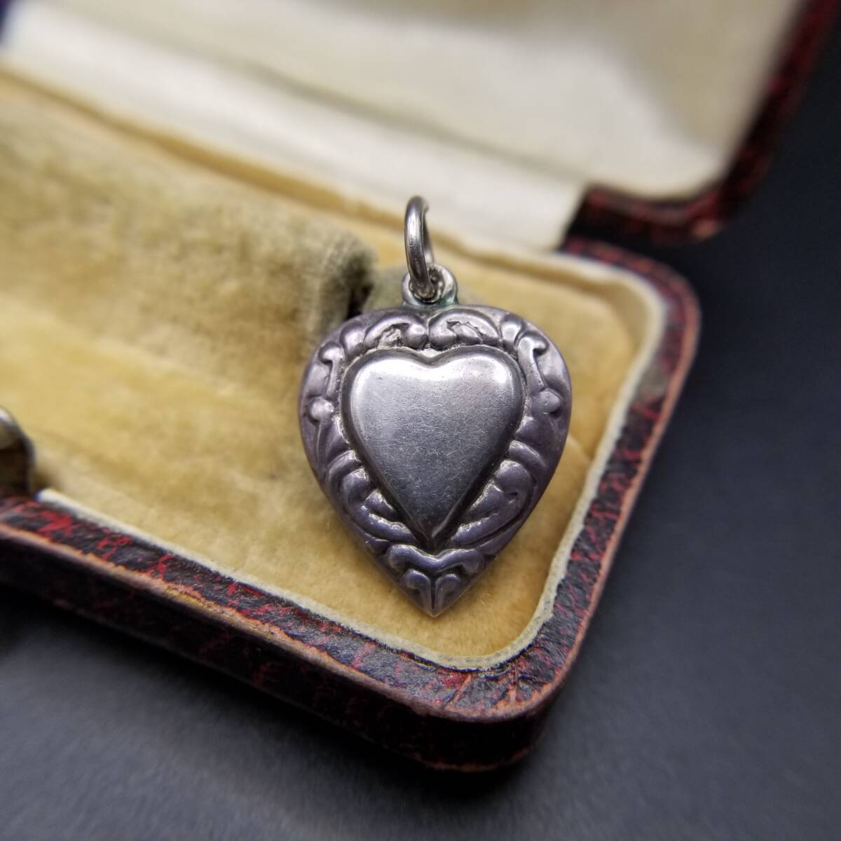 - アールヌーヴォー ヴィンテージ パフィーハート チャーム ペンダントヘッド シルバートーン レトロ キュート Y25-C