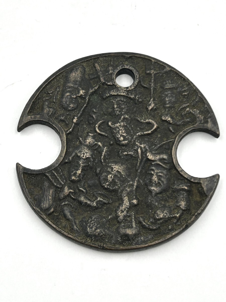 - 1円スタート 大型絵銭 鍔銭 分銅型 七福神 神鏡狐稲荷図 径63.9㎜ 重量90.1g 古銭 TK1022-8