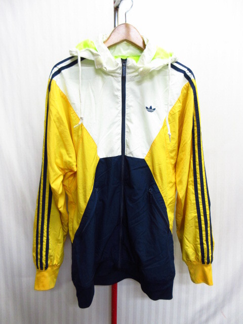 - アディダス 00sヴィンテージ トレフォイル刺繍ナイロンパーカー メンズO XL LL 黄紺白 フード付ジャージトップ ウインドブレーカー10172