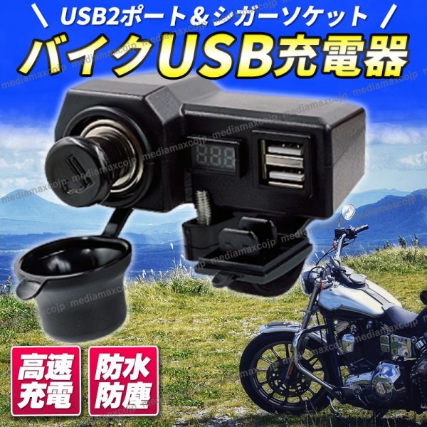 - バイク シガーソケット USB 2ポート 12V 汎用 ON OFF スイッチ 防水キャップ スマホ充電 USB 電源 充電 シガーライター 電圧計 防水 防塵