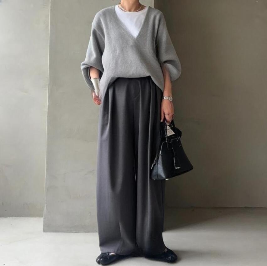 > 人気推薦/秋新作 シンプル セットアップ 高級感満載 気質 通勤 重ね着風 グレーのスウェット TOPSグレー パンツ 2点セット /