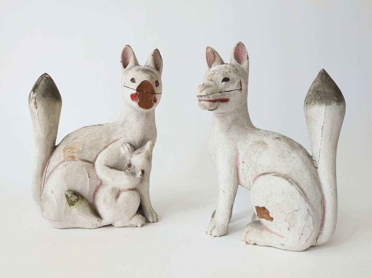 - 木彫大型 玉眼寄木造りの小狐を抱く夫婦稲荷 狐像 神像 骨董 古美術 神道 神社 奉納 一体 阿吽 胡粉 白狐 彫刻 江戸時代 呪物 日本美術仏師