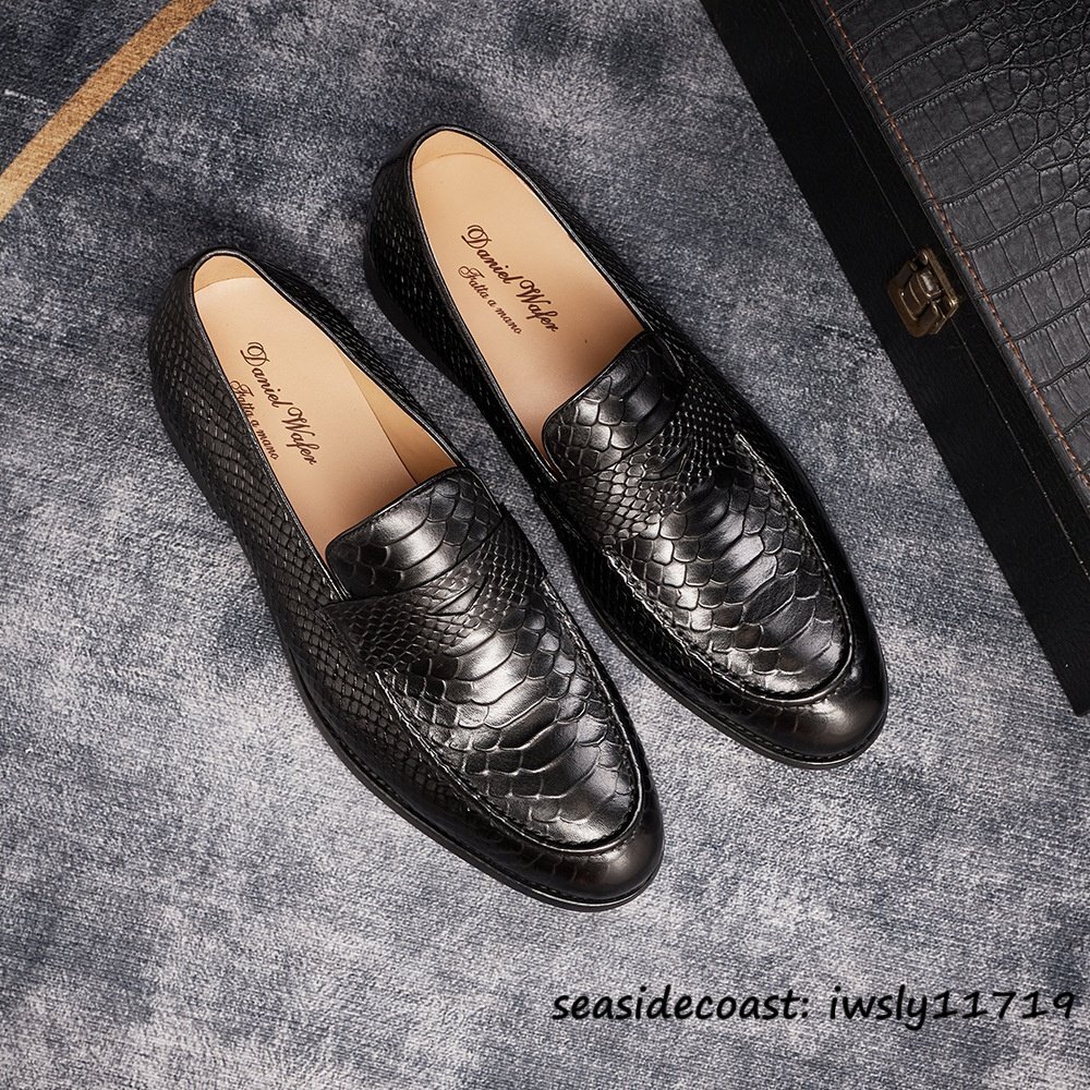 - 極美品★本革 鰐柄 スリッポン ローファー 職人手作り 高級牛革 レザーシューズ メンズ ビジネスシューズ ドレス 結婚式 ブラック 24.5cm