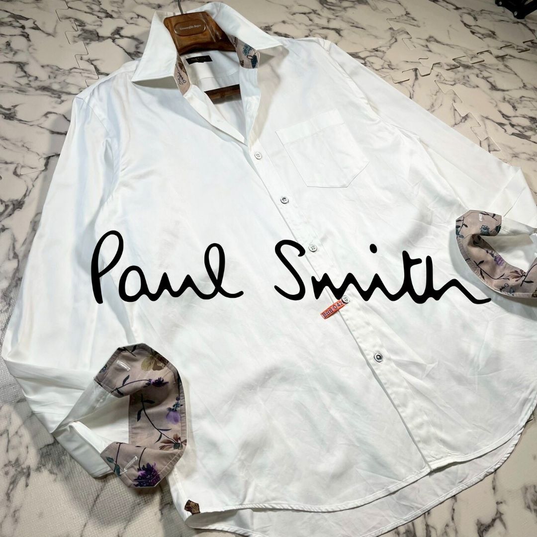 > 極美品/裏地花柄(XL)●ポールスミス 長袖 シャツ 白 ホワイト カジュアル フラワー 光沢 Paul Smith COLLECTION メンズ 秋冬 ビジネス 無地