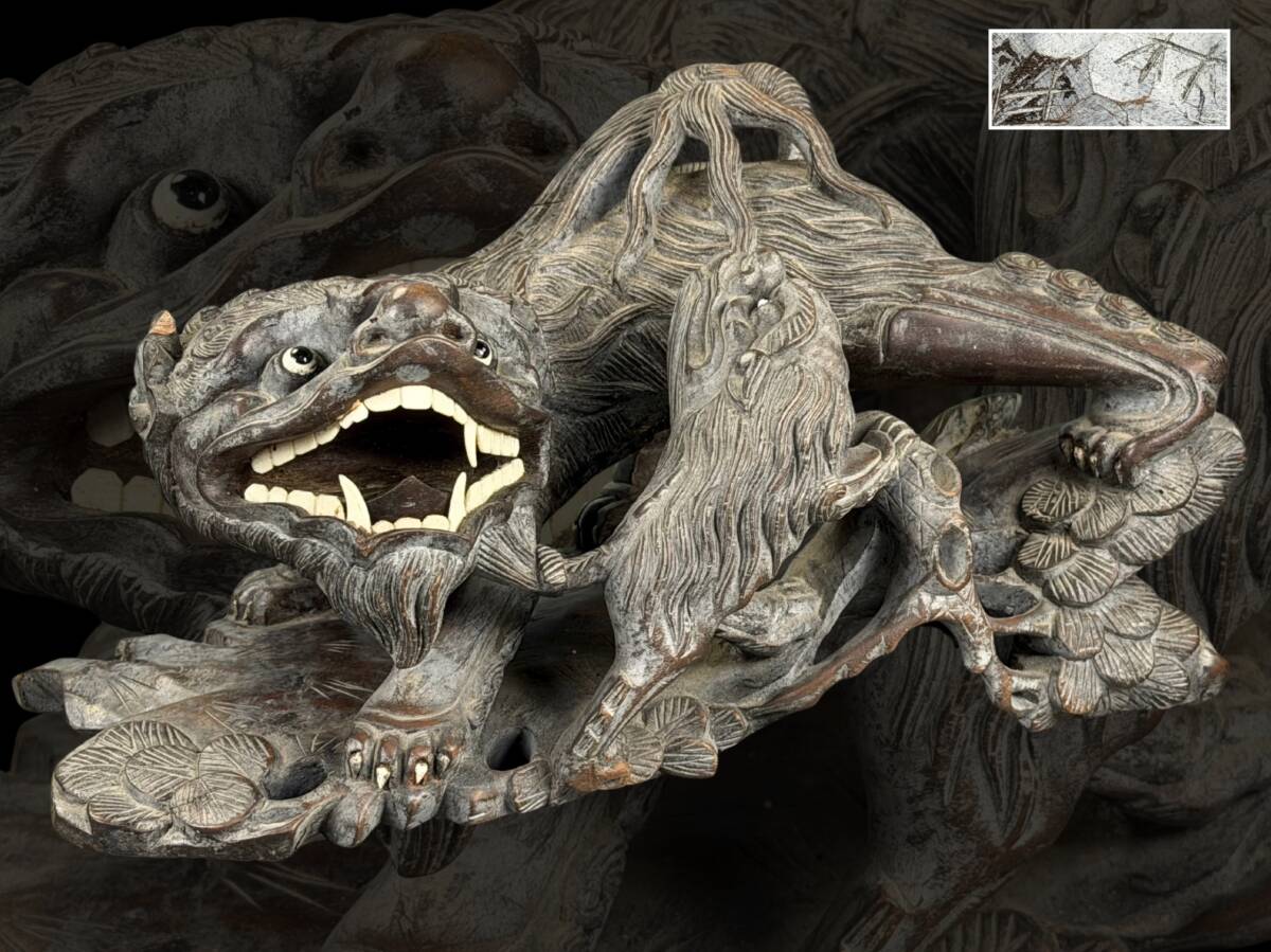 > 【偲】古美術 唐木像 玉眼 唐獅子親子 幅約31cm 高約17cm 置物 飾り物 細密細工 細密彫刻 木像 r-1019