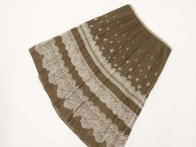 > 美品 トランスワーク TRANS WORK ひざ丈 シフォン変形プリーツフレアスカート 40 ブラウン地 アイボリー レース柄 【メール便可】