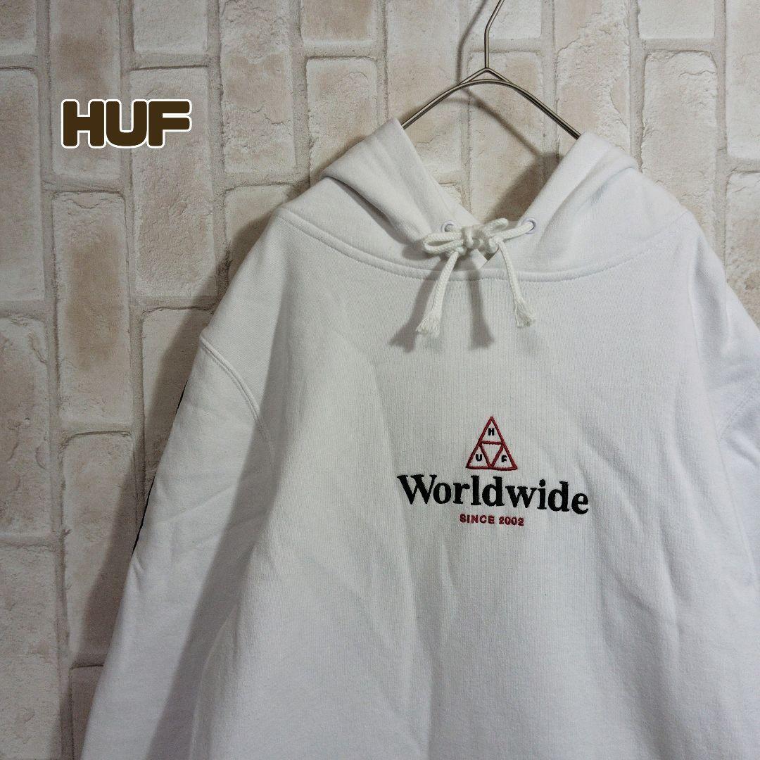 - ハフ パーカー 白 プルオーバー 刺繍 アーム ロゴ