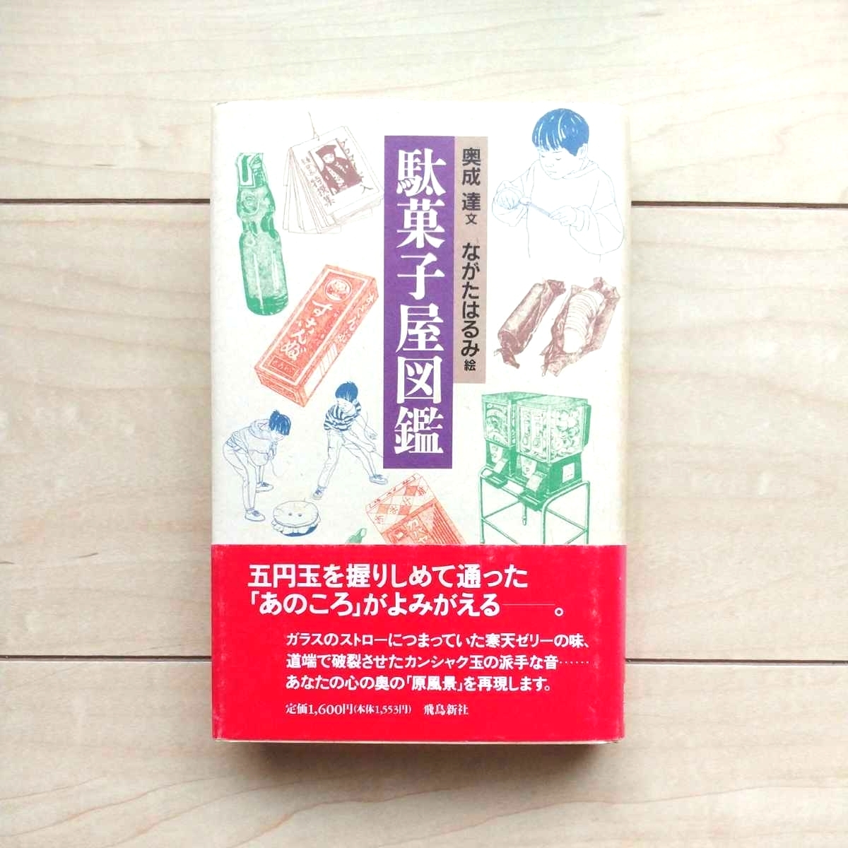 - ■『駄菓子屋図鑑』奥成達著。ながたはるみ挿画。平成7年初版カバー帯。飛鳥新社刊。駄菓子屋風景・路地裏の遊びが仔細緻密に描写。