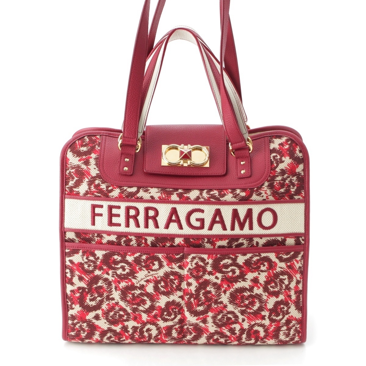 > サルヴァトーレフェラガモ ガンチーニ アイコニック キャンバス レザー ロゴ 2WAY ショルダー トートバッグ AU-21/1418 ボルドー【中古】
