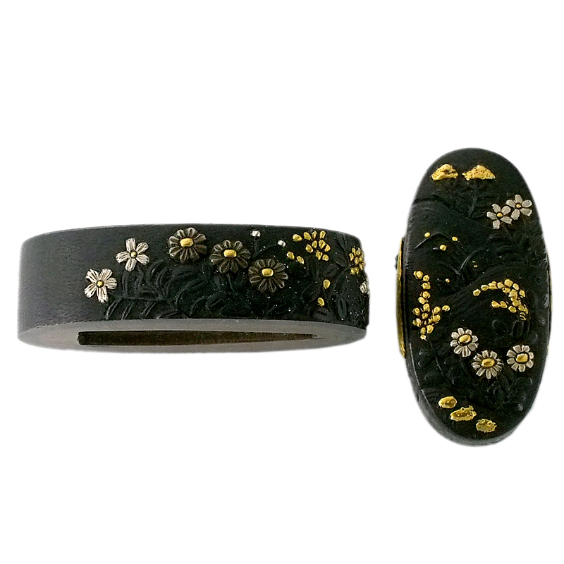詳細:秋草図縁頭 貴重小道具認定書 無銘(古美濃) サイズ【縁】:1.1cm×3.9cm サイズ【頭】:3.4cm×1.8cm 素材:赤銅石目地 実重量:36.8g 付属品:桐箱、認定書(昭和48年/日本美術刀剣保存協会)