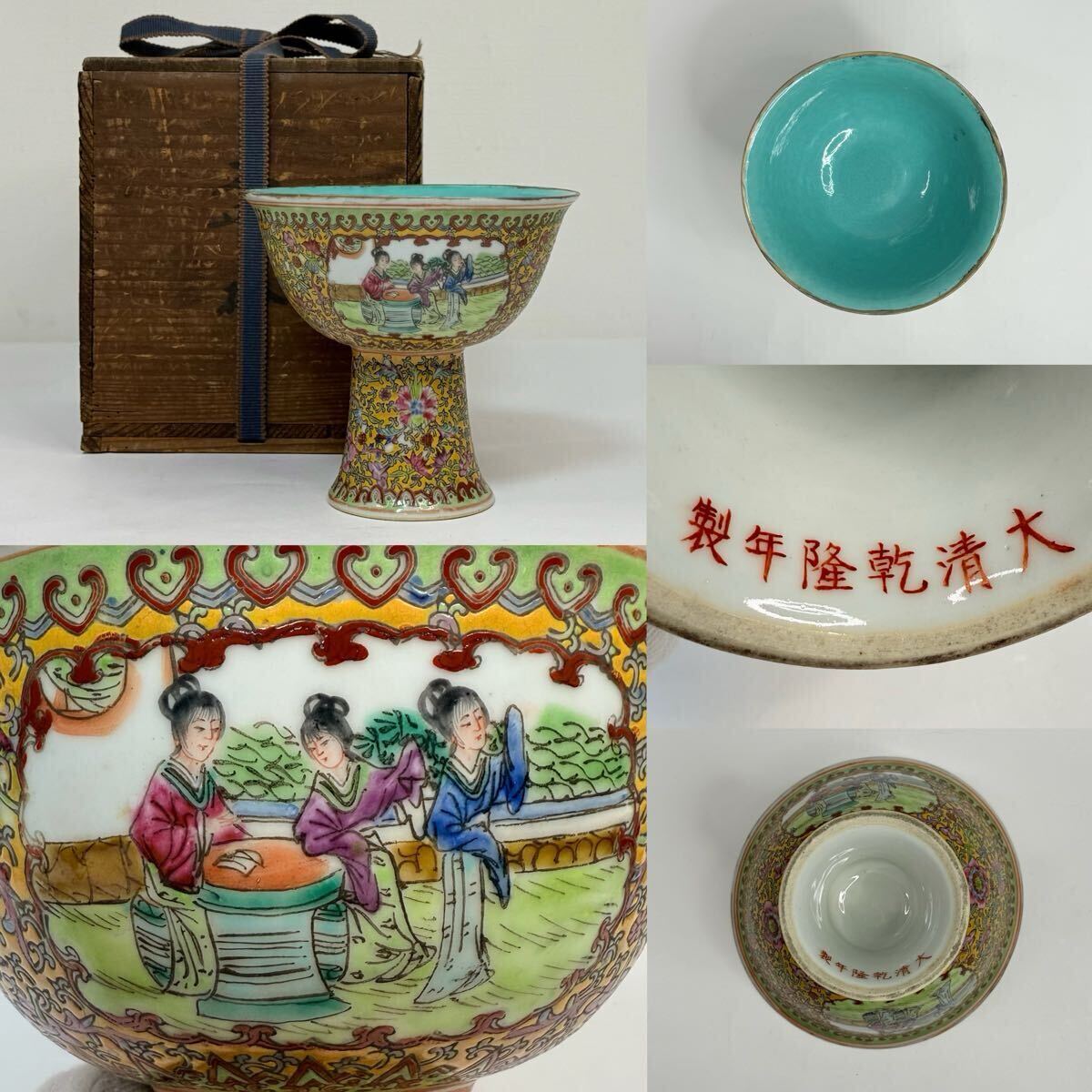 > F3-中国古美術 時代物 色絵 粉彩 高足杯 人物図 共箱付 在銘 大清乾隆年製 唐物 陶磁器 中国古玩 骨董品