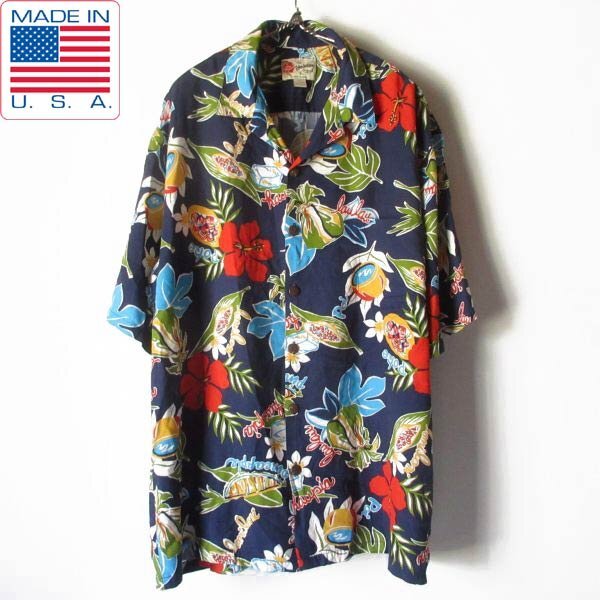 - USA製 Hilo Hattie ボタニカル柄 レーヨン 半袖 アロハ シャツ 紺系 XL ネイビー ハワイアン アメリカ製 D152-04-0009ZVW