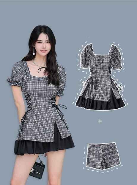 - スカート水着 水着ワンピース レディース 体型カバー キレイめ 夏 おしゃれ 2XL チェック柄×ブラック