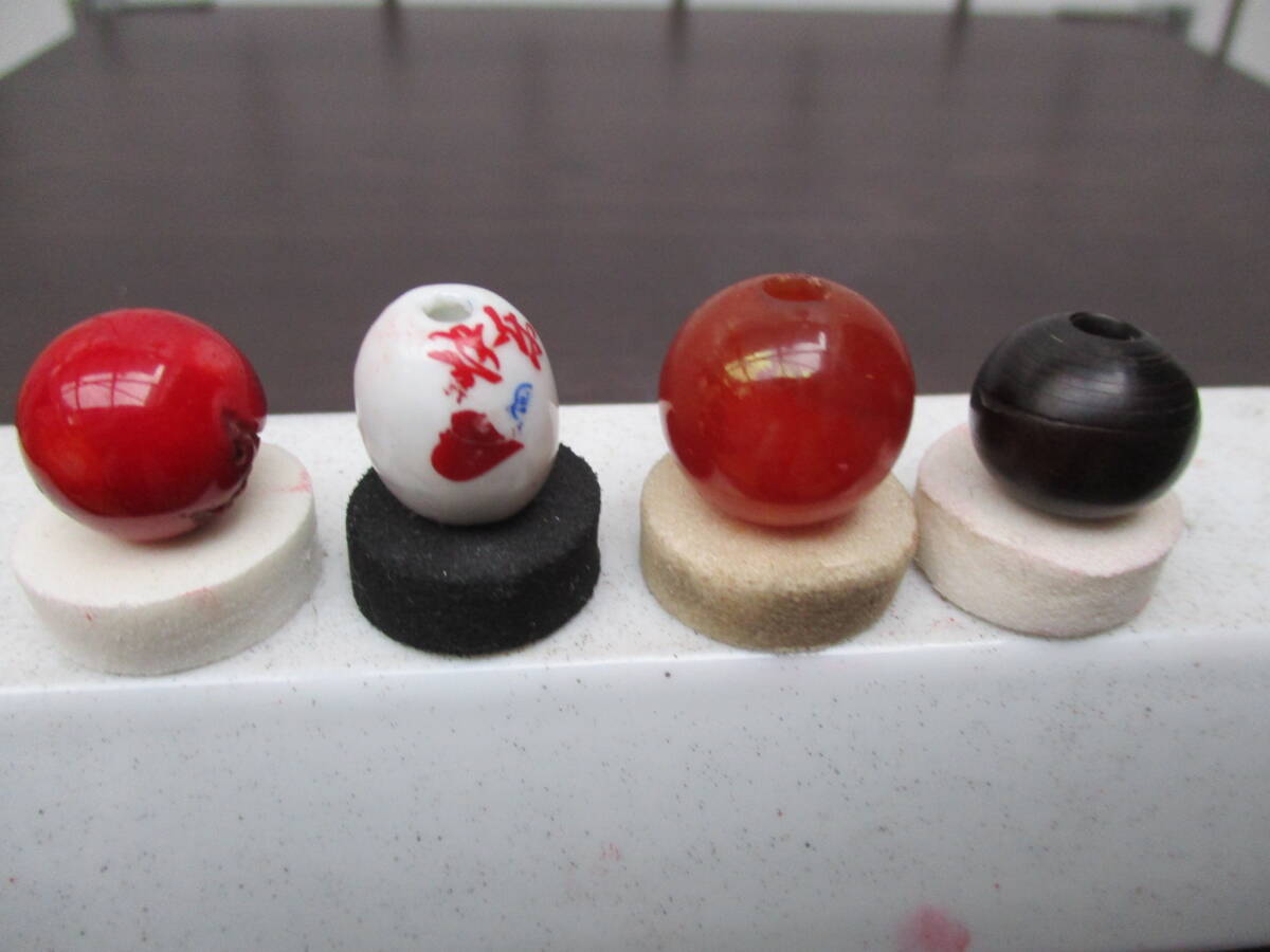- 根付け-緒締め四体【《紅》珊瑚, 《白磁》陶磁器, 《赤色》瑪瑙, 樺細工《桜皮細工》丸玉 時代物★ 根付★ 印籠】