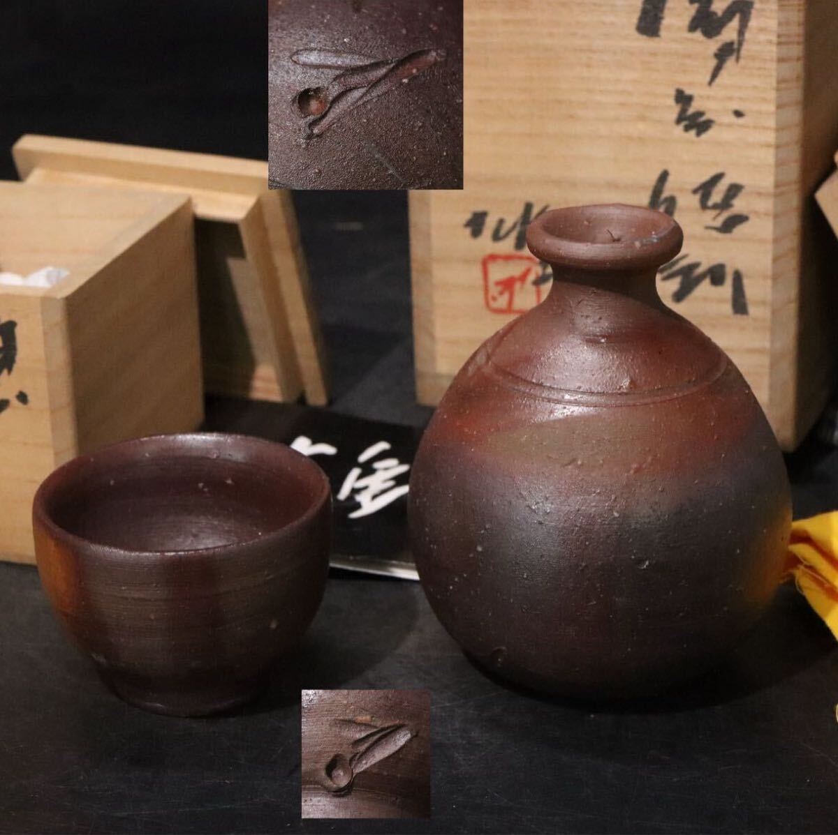 - 藤原雄 作 備前 酒器セット 「 徳利 ・ ぐい呑み 」 各 共箱・共布 / 備前焼 人間国宝 煎茶碗 手造 手捻り .B1307