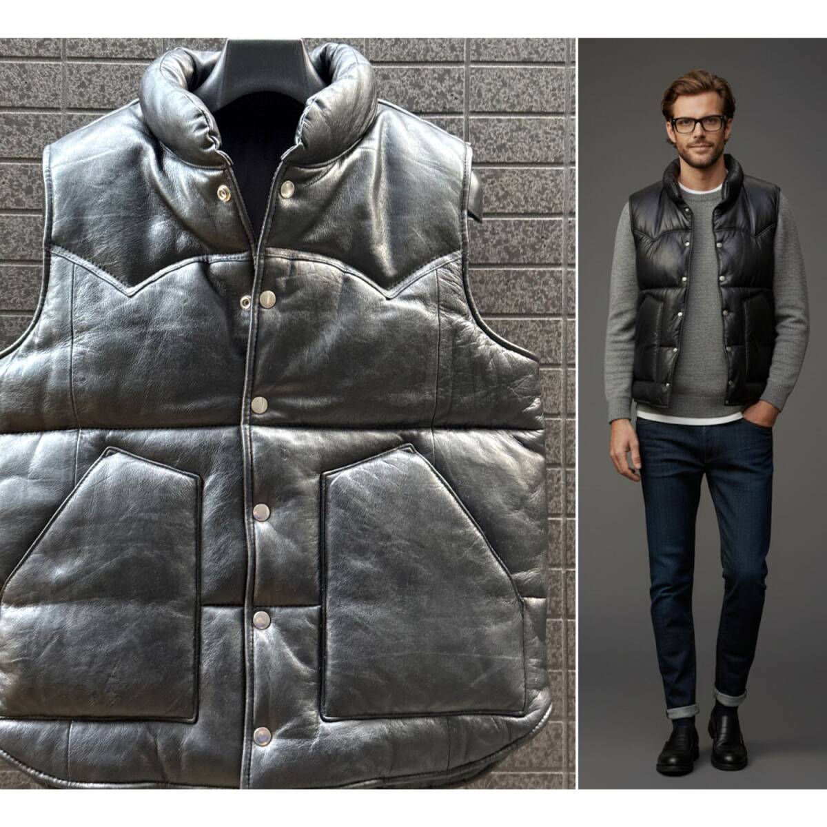 - ◆アウトレット出品◆XLサイズ 本革リッチレザーダウンベスト黒 リアル牛革 オールブラック 秋冬春 メンズ 中綿Fダウン ※条件付送料無料