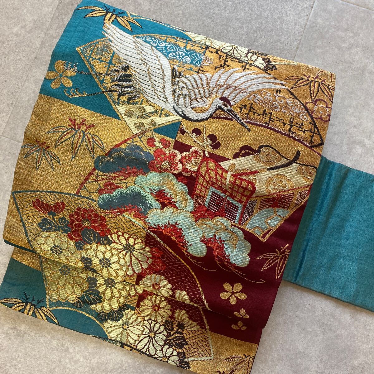 - アンティーク 名古屋帯 着物 緑 松 菊 鶴 金糸 赤茶 金昭和レトロ 大正ロマン モダン 和洋折衷コーデ リメイク 25こ29-16s