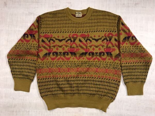> ビースポーツ BE SPORTS レトロ オールド アート デザイン オリエンタル 民族エスニック ジャガード ニット セーター メンズ M マスタード