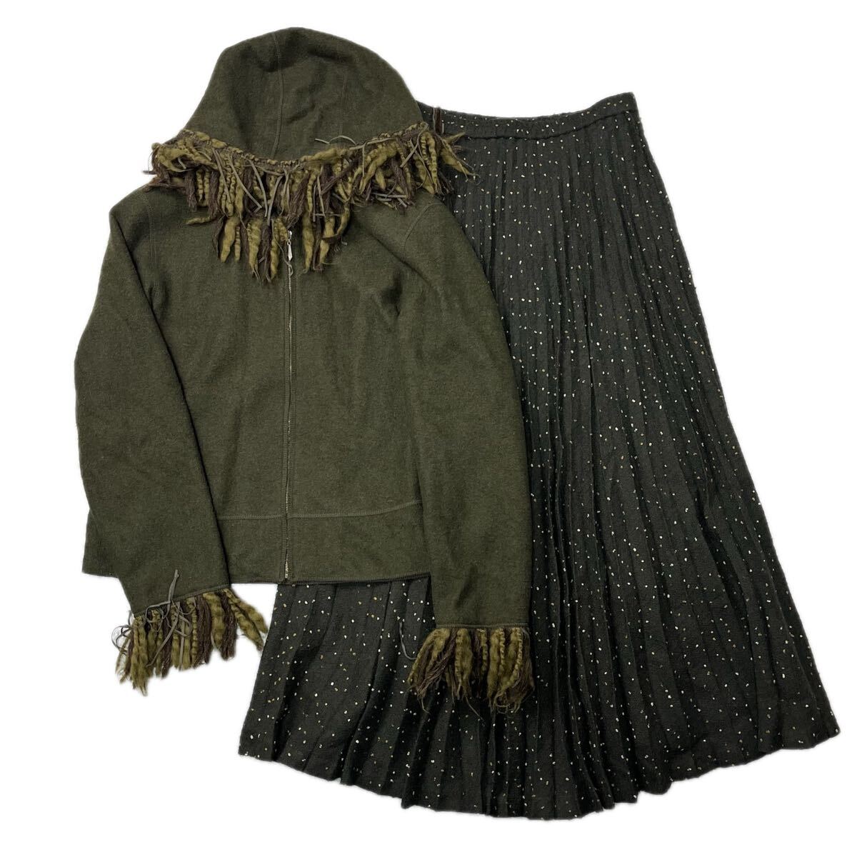 - moitie moite フリンジ セットアップ パーカー ロングスカート アンサンブル カーキ 42 ウエストゴム ウール モヘア ナイロン