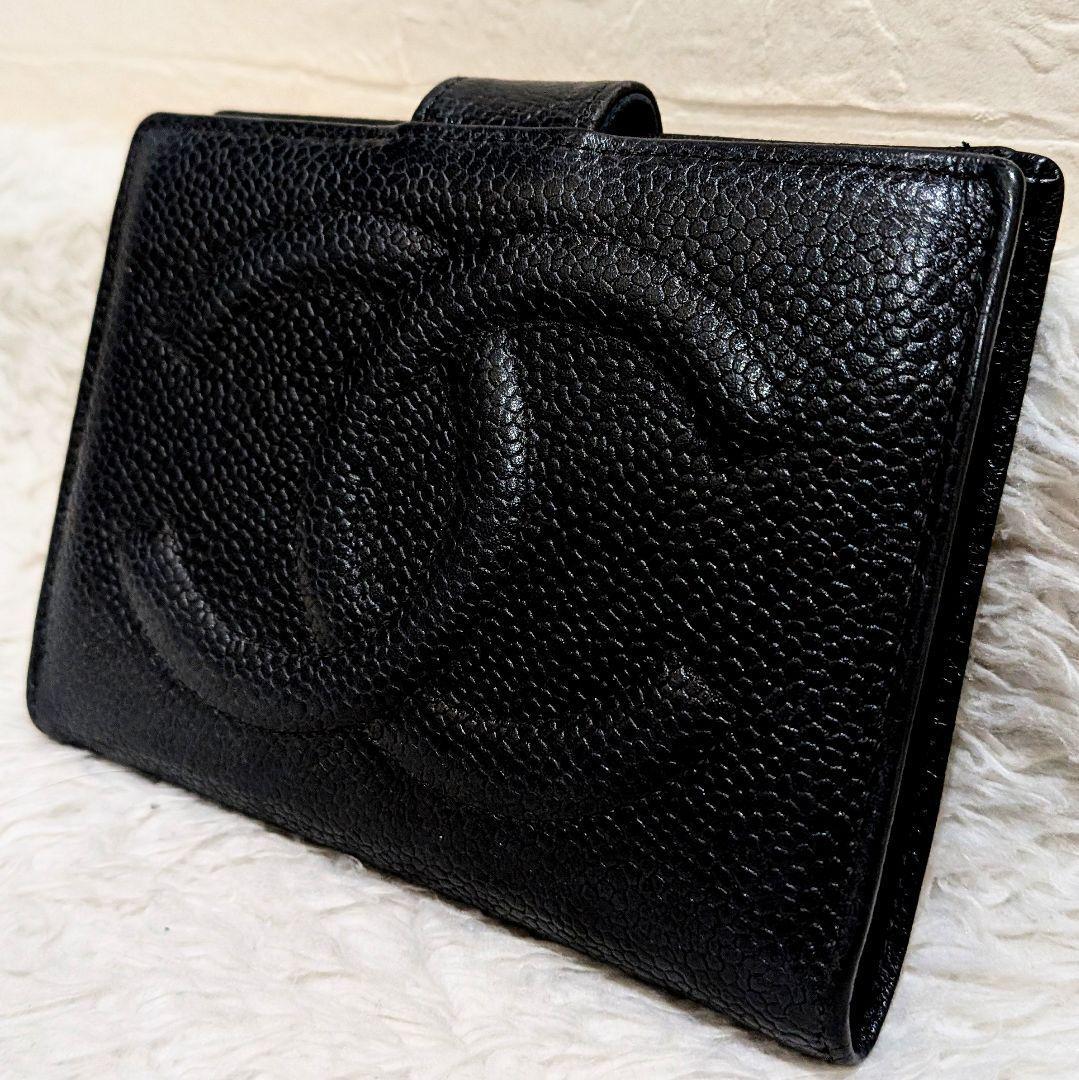 - 良品 CHANEL キャビアスキン 折財布 がま口 デカココマーク ブラック ヴィンテージ シャネル 黒 レディース 本革 ステッチ ウォレット