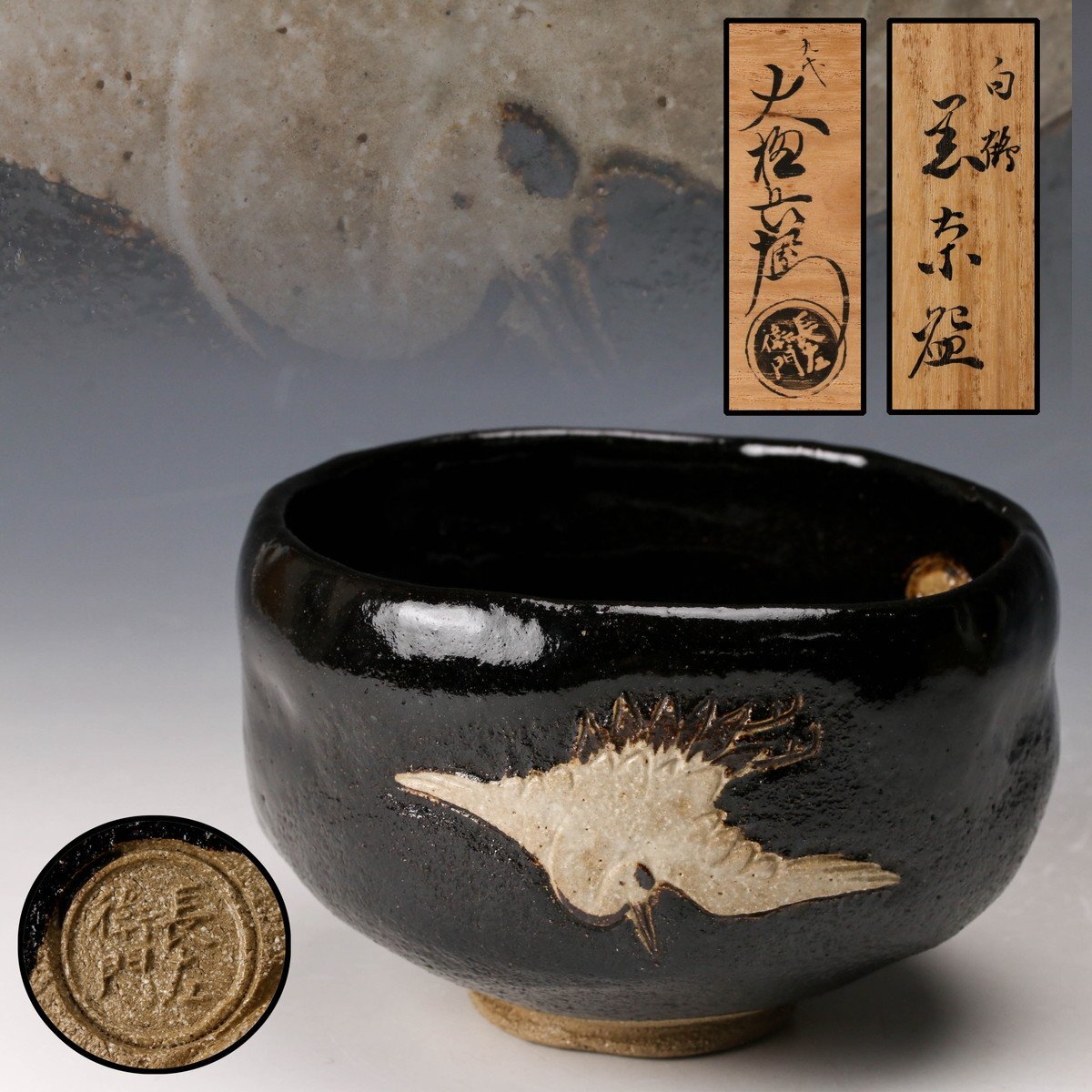 【佳香】九代 大樋長左衛門 白鶴黒茶碗 共箱 共布 茶道具 本物保証