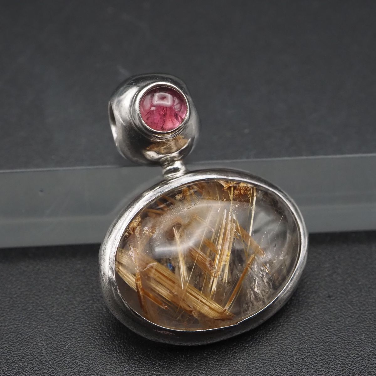 - H463 ルチルクォーツ ピンクストーン ペンダント トップ デザイン シルバー チャーム ヘッド ヴィンテージ