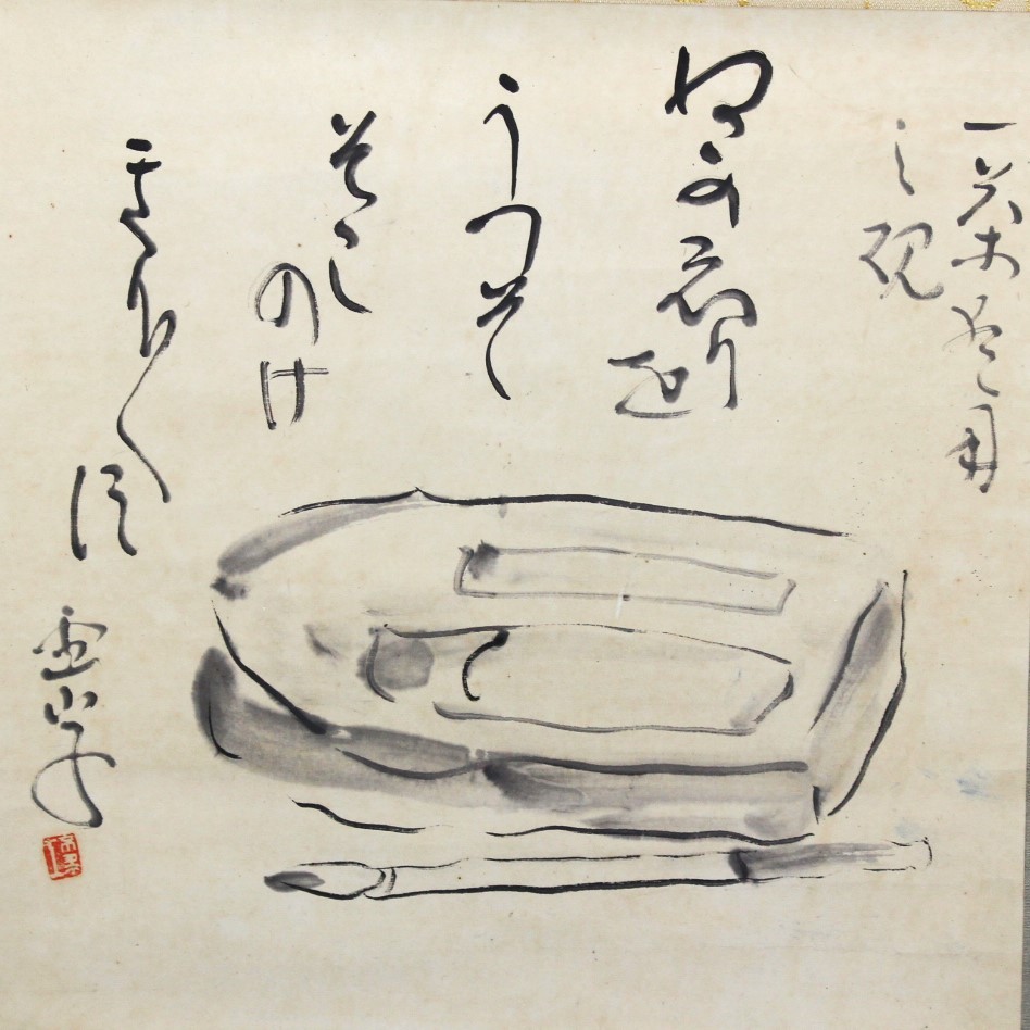 - 《真作》★磯野 霊山【一茶愛用の硯】俳画.掛軸.横幅*異色作家*新潟.高田.長岡の記者で活躍*スキー普及**洒落掛*佐賀.物故*[桃]