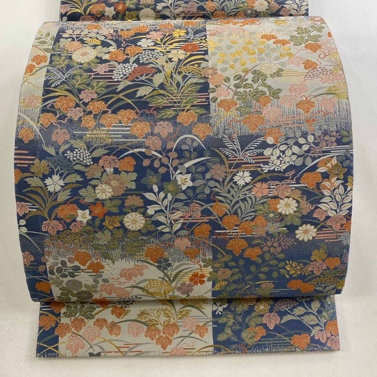 - 【美品】 袋帯 秀品 落款 藤三郎 秋草 芝 箔 青灰色 六通 正絹 【中古】
