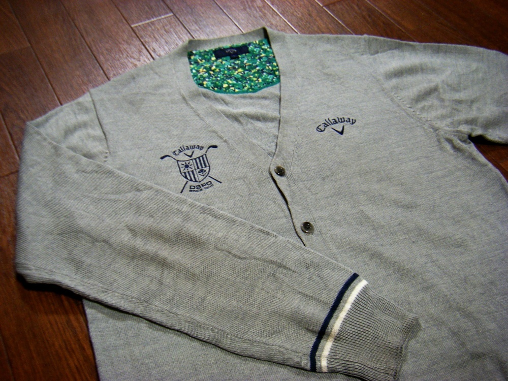 > ウール混〇Callaway ニット カーデ L やや薄手 刺しゅうロゴ グレー同色濃淡
