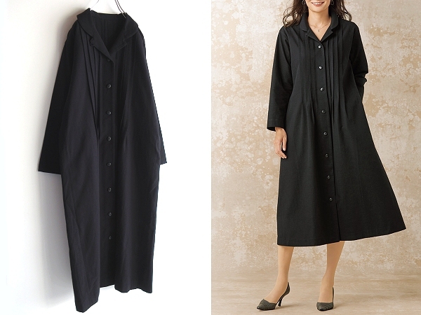 - 未使用 定価129800円 久留米絣工房 藍木野 西原織物 コットン ショールカラー 丸襟 タックワンピース ドレス FREE 黒 ブラック 日本製
