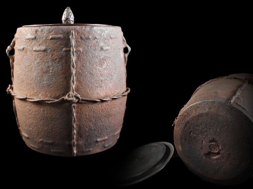 > 【雲】某有名収集家買取品 時代 名工釜師 双耳 網目 茶釜 筒釜 古美術品(風炉用 茶道具 鉄釜 古鉄)Y7221 OTOmnjuy