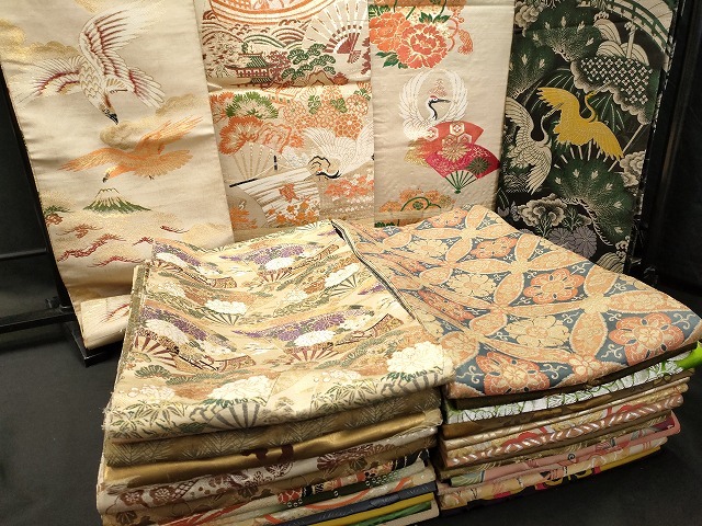 > 平和屋本店■アンティーク 大正ロマン 袋帯 丸帯 まとめて 30点 レトロ 鶴 鷹 風景 花柄 七宝 楽器 など 未使用品あり 全て正絹 ppp2987