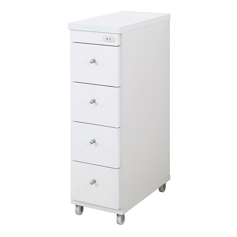 - 隙間収納 幅 25cm すき間 収納 棚 洗面所 キッチン 4段 引き出し ランドリー キャスターつき コンセント付き 日本製 高品質 白 ホワイト