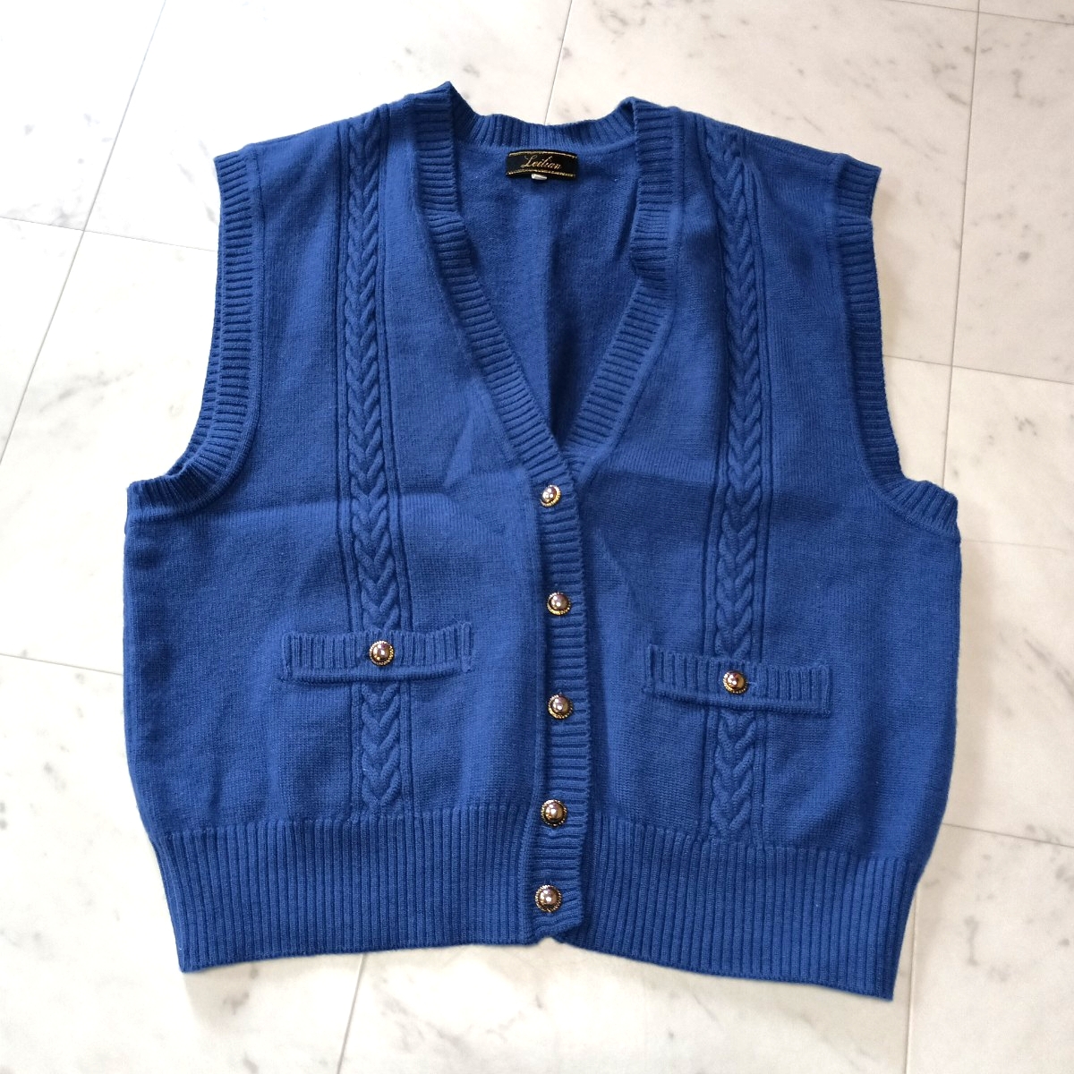 > 71 leilian レリアン ニットベスト ベスト 金ボタン ウール チョッキ 羽織り サイズ13+ ブルー 大きいサイズ ビッグサイズ 51101B